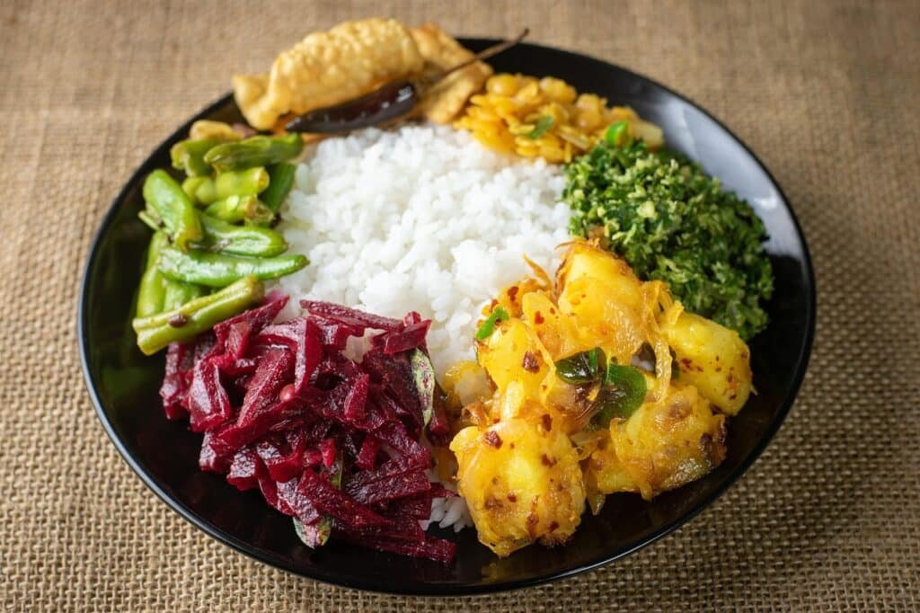 This meal includes steamed rice served with several small curries. These can be vegetable curries, lentil curry, fish curry, chicken curry, or beef curry. Sambols, pickles, and crispy papadams are also added.
